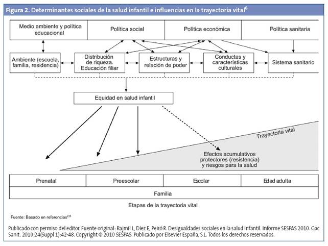 Las condiciones de vida de la primera infancia, la escolarización, la naturaleza del empleo, las condiciones de trabajo, las características físicas del medio construido y la calidad del medio natural en que vive la población influirán de manera importante en las oportunidades de vida y la posibilidad de gozar de buena salud al llegar a ser personas adultas5. Se genera un círculo vicioso en el que la mala salud, junto con la posición social, conlleva la mala salud de la generación siguiente6. La primera infancia es fundamental para adquirir recursos y capacidades, que facilitan mayores posibilidades de afrontar los retos de la vida condicionando el riesgo de desarrollar obesidad, malnutrición, problemas de salud mental, enfermedades cardiacas y delincuencia7.