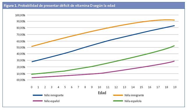Conclusiones: el déficit de vitamina D es muy frecuente en nuestro medio. Los inmigrantes de sexo femenino, sobre todo si son adolescentes, son los que tienen más probabilidad de presentarlo.
