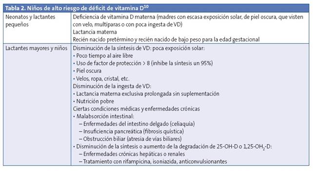 Introducción: en los últimos años han surgido propuestas diferentes sobre la necesidad de suplementar la dieta con vitamina D. Estamos asistiendo a un repunte del déficit relacionado con situaciones que aumentan el riesgo: prematuridad, lactancia materna exclusiva prolongada, personas de piel oscura, menor exposición solar.