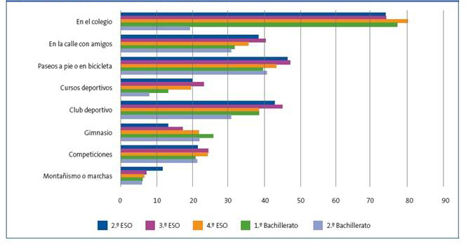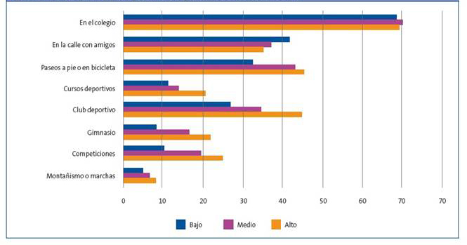 Por último, se analiza el ejercicio físico, encontrando que el 95,8% lo hacen a diario. Es mayor el porcentaje de chicas que declara no hacer ejercicio (el 5,8% frente al 2,8% de los chicos, p < 0,001). Se observa una disminución del ejercicio físico en los alumnos de cursos superiores (el 15,5% de los alumnos de 2.º de Bachillerato declara no hacer ejercicio frente al 3% de 2.º de la ESO). También es más frecuente no realizar ejercicio físico en niveles socioeconómicos bajos (el 9,3% frente al 3,7%, p= 0,02). El tipo de ejercicio físico y el lugar donde refieren hacerlo se detallan en las Fig. 1, Fig. 2 y Fig. 3 y en la Tabla 3. El ejercicio físico de competición es más frecuente en el sexo masculino (28,7%) que en el femenino (15,4%) (< 0,001) y en nivel socioeconómico alto (el 24,9% frente al 10,2%, p < 0,001).