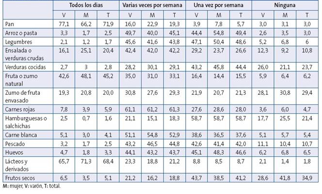 En relación al desayuno el número de días a la semana que los adolescentes desayunan ha sido: todos los días el 79,2%; entre 4-6 días a la semana el 4,9%; de una a tres veces semanales el 4,5%; solo los fines de semana el 7,4%. Refieren que no desayunan nunca el 4%. A diario desayunan con más frecuencia los chicos (84,1%) mientras que las chicas desayunan el 73,7% (p < 0,001). Por curso, se encuentra una disminución de la frecuencia de desayuno a medida que los adolescentes se hacen mayores: desayunan a diario el 81,7% de los adolescentes de 2.º de la ESO y el 75,7% en 2.º de Bachillerato, aunque no se aprecian diferencias estadísticamente significativas (p = 0,127). Los alimentos que toman al desayuno han sido lácteos o derivados (89,3%), cereales (45,1%), pastas, galletas o magdalenas (44,6%), fruta o zumo (22,9%), pan o tostadas (22,1%) y otros alimentos (7,9%).