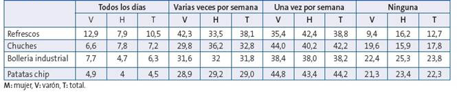 Para los alimentos y bebidas no saludables, en la Tabla 2 se describe el porcentaje de los adolescentes que toman refrescos, chucherías, bollería industrial, postres dulces y patatas chips según el sexo. No encontramos diferen cias por curso, ni por nivel socioeconómico, excepto en el consumo de refrescos, que se asoció significativamente al bajo nivel socioeconómico.