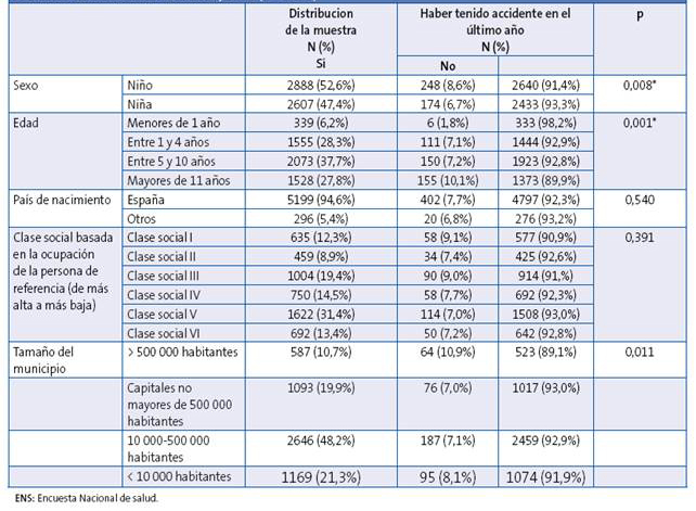 Las variables estudiadas fueron accidente (haber sufrido algún tipo de lesión en el último año), lugar del mismo, asistencia precisada y el daño sufrido (contusión, fractura, quemadura, intoxicación, otros efectos, sin daños), sexo, edad, país de nacimiento (España o fuera de España), tamaño del municipio donde reside y clase social (ocupación del principal sustentador).