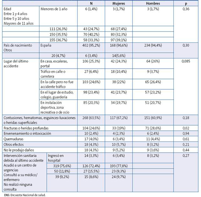 Main objective: to describe the prevalence and analyze the sociodemographic factors associated with having suffered unintentional injury in the population under 15 years in Spain in 2011. Secondary objectives: To describe the place where the accident occurs, the assistance and the damage occurred.