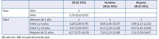 El riesgo aumentó con la edad y fue menor en ni ñas (OR: 0,76) que en niños (Tabla 3). Entre el pri mer año y los cuatro años es mayor el riesgo en niños (OR: 4,7 frente a 3,7), entre los 5 y los 10 años disminuye la diferencia (OR: 4,1 frente a 4,5), para aumentar de forma significativa en mayores de 11 años, donde observamos un riesgo en niños dos puntos superior al de las niñas (OR: 7,2 frente a 5,1).
