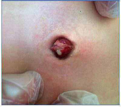 Presentamos el caso de una lactante de cinco meses, que consulta por irritabilidad progresiva de diez días de evolución. Asocia algún vómito aislado, sin fiebre ni cambios en la orina o las deposiciones. En los últimos días inicia distensión abdominal y el mismo día de la consulta presenta una expulsión de exudado purulento por el ombligo, motivo por el que fue derivada desde la consulta de Atención Primaria al Servicio de Urgencias.