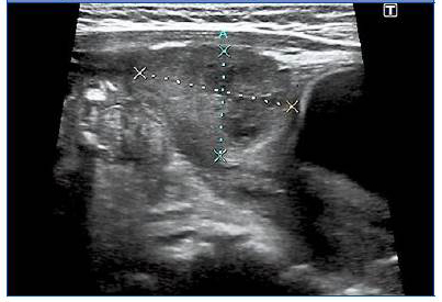 A las 24 horas de ingreso se realizó una ecografía de abdomen, donde se visualiza adyacente a la zona superior de la vejiga hacia el ombligo una colección heterogénea de 5,5 × 2,5 × 2,4 cm (Fig. 2), con diagnóstico de probable quiste de uraco infectado. Posteriormente se aísla en cultivo de exudado Staphycoccus aureus, manteniendo el tratamiento con cloxacilina con buena evolución, desaparición de los signos inflamatorios y de la secreción purulenta. Es dada de alta a los seis días de ingreso, con seguimiento por Cirugía Pediátrica.