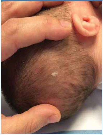 Lactante de 36 días de vida, sin antecedentes personales de interés, que acude a Urgencias, traído por sus padres porque "tiene una pluma en la cabeza". Refieren sus padres que, al cortarle el pelo hace un par de días han notado que tiene en la cabeza una pequeña pluma blanca. No saben si la tiene desde el nacimiento o si le ha salido después. Refieren que está perdiendo mucho pelo, pero que la pluma no se le cae.