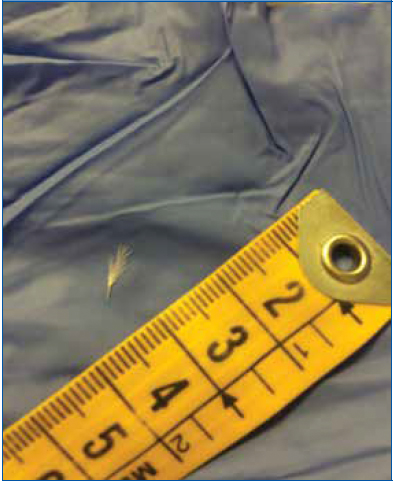 Se pregunta a los padres sobre el posible origen de la pluma (colchones o almohadas de pluma de ave). Refieren la ropa de cama del bebé no es de plumas, pero sí el edredón de la cama de los padres, donde el bebé duerme algunas noches y donde la madre lo amamanta por las noches. Tras acudir al domicilio, los padres aportan varios fragmentos de plumas que salen del edredón de su cama, con facilidad, y que son similares a la extraída de la cabeza del niño (Fig 3).