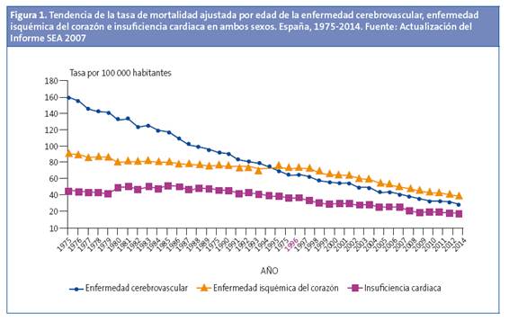 La ECV constituye la primera causa de muerte en la población española, originando en 2014 un total de 117 393 muertes, lo que supone el 30% de todas las defunciones6. La tendencia temporal en mortalidad ajustada por la edad en ECV se encuentra en descenso en los últimos 40 años (Fig. 1). Por el contrario, las tasas de morbilidad hospitalaria por ECV casi se han triplicado en España durante ese periodo, aunque mostraron una disminución entre 2003 y 2012 (Fig. 2)7. Más de la mitad de la reducción de la mortalidad cardiovascular se ha atribuido a cambios en el nivel de factores de riesgo en la población, especialmente la reducción de la colesterolemia, la presión arterial (PA) y el tabaquismo, una tendencia favorable contrarrestada parcialmente por el aumento de otros factores de riesgo, principalmente la obesidad y la diabetes mellitus tipo 28.