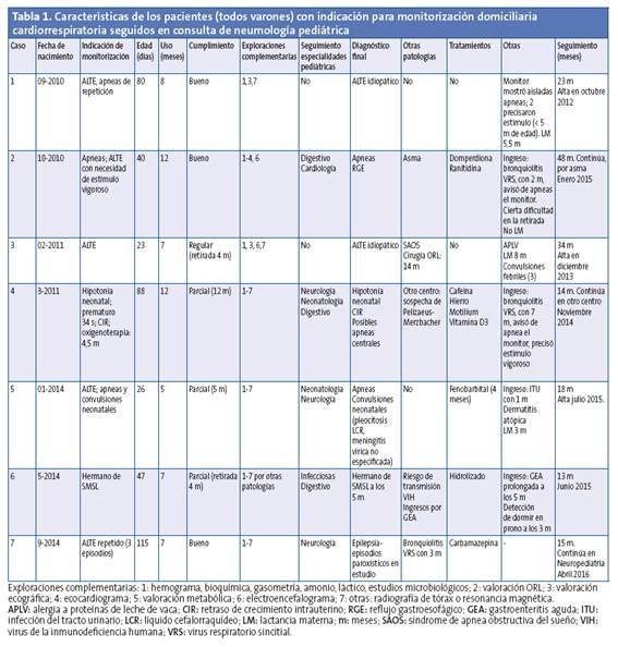 Se monitorizaron siete pacientes (aproximadamente 7/10 000 nacidos), todos varones (Tabla 1). La indicación inicial de monitorización CRD fue ALTE de repetición o ALTE grave (cinco casos), hipotonía neonatal grave (un caso) y el hermano de un paciente con SMSL (un caso). La edad media de indicación fue de 59,8 días. Tres tuvieron cumplimiento parcial, y uno retiró precozmente la monitorización. El diagnóstico final fue ALTE idiopático en dos pacientes. Uno tuvo apneas asociadas a reflujo gastroesofágico. Otro caso fue por hermano de la víctima de SMSL. El resto fue por enfermedad neurológica.