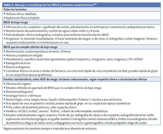 Si no se cumplen los criterios de BRUE o hay signos de riesgo, entonces tienen mayor probabilidad de tener una causa de base importante o episodios recurrentes; se requerirá observación y estudios para descartar enfermedades subyacentes. Y si hay sospecha de una causa concreta (reflujo gastroesofágico, enfermedad infecciosa, metabólica, neurológica, etc.), el estudio será en función de la sospecha (Tabla 2).