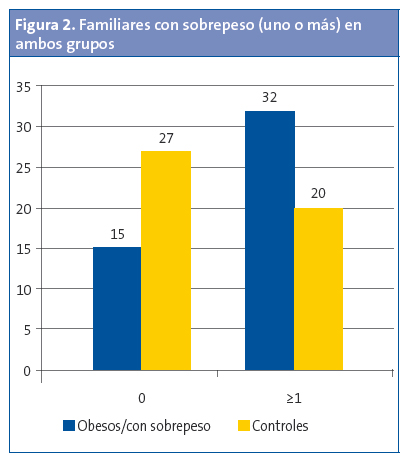 Familiares con SP/OB (Fig. 2): más del doble de los niños con SP/OB tenían uno o más familiares con obesidad (32/15). En los no SP/OB la proporción era similar (20/27).