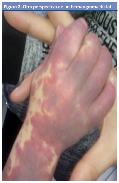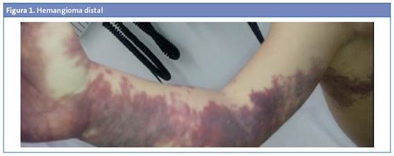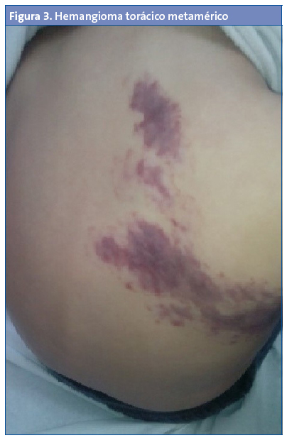 Se trata de una recién nacida a término, hija única, con embarazo controlado sin incidencias y parto vaginal eutócico, que presenta desde el nacimiento extensas lesiones segmentarias a nivel torácico, que se extienden de forma metamérica hasta la mitad de la espalda y afectan al miembro superior derecho y la mano ipsilateral (siendo esta de mayor tamaño que la izquierda); las lesiones son compatibles con dos hemangiomas. Es valorada por el Servicio de Dermatología, mediante ecografía Doppler, con la que se confirma una malformación vascular capilar extensa; se solicita una resonancia magnética (RM) del miembro y seguimiento en consulta externa.