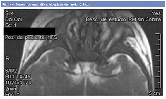 En nuestro caso, la paciente presenta un extenso hemangioma en el tronco y el brazo asociado a la hipoplasia severa de la vía óptica (mayor en el lado izquierdo), además de la displasia cerebelosa y malformación en el desarrollo cortical, revelado en el estudio de extensión por RM (Fig. 4), por lo que cumple criterios del punto 2B: posible síndrome de PHACE(S).