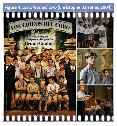 Los chicos del coro (Christophe Barratier, 2004), porque la música de Bruno Coulais convierte la melodía y las canciones en un personaje principal de la obra, una creación sonora que juega con la emoción y con canciones grabadas con los Petits Chanteurs de Saint Marc en Lyon (una de las canciones, "Vois sur ton chemin", logró estar nominada al Oscar). Y algunas frases expresan este valor de la música en la educación de la infancia, como esas palabras del profesor Clément Mathieu "Están cantando... no cantan bien, pero cantan" o "La música cambia a las personas" (Cine y Pediatría 259)10 (Fig. 4).