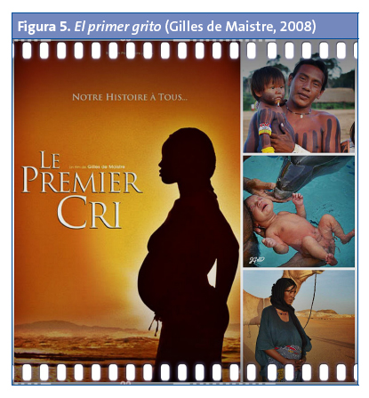 El primer grito (Gilles de Maistre, 2008), cuya banda sonora de Armand Amar, peculiar compositor con influencia de tres culturas tan diferentes como la hebrea, la islámica y la occidental, nos transporta a historias que nos hablan del embarazo y parto en el mundo y donde su canción nuclear, "A new born child", interpretada por una cantante tan comprometida como Sidnead O'Connor, es verdadero leitmotiv (Cine y Pediatría 220)11 (Fig. 5).