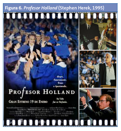Profesor Holland (Stephen Herek, 1995), una maravillosa película sobre la enseñanza con deliciosas referencias musicales a la Séptima Sinfonía de Beethoven o al "Imagine" de John Lennon, desde Jimi Hendrix a Bach, de George Gershwin a Queen, de The Beatles a Jackson Brown, de Mozart a Ray Charles. Allí donde el compositor de bandas sonoras, Michael Kamen realiza para esta película una de sus mejores partituras, con temas tan simbólicos como "Cole's tune" o la celebradísima "An American symphony". Y esa frase final apoteósica: "Mire a su alrededor. No hay una sola vida en esta sala en la que usted no haya influido. Y todos nosotros somos mejores personas gracias a usted. Nosotros somos su sinfonía, señor Holland. Somos las melodías y las notas de su concierto. Y somos la música de su vida" (Cine y Pediatría 312)19 (Fig. 6).