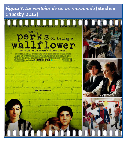 Las ventajas de ser un marginado (Stephen Chbosky, 2012) y su homenaje a algunos de los temas más memorables de finales de la década de 1980 y principios de la de 1990 (The Smiths, The Samples, The Reivers...), así como también al musical "The Rocky Horror Picture Show". Pero la seña de identidad de esa película es la canción "Heroes" de David Bowie, con la que nuestros tres adolescentes protagonista buscan el amor que creemos merecer con los brazos al aire y bajo el túnel: "Escuchas la canción... y en ese instante sientes que somos infinitos" (Cine y Pediatría 197)25 (Fig. 7).