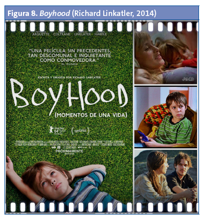 Boyhood (Richard Linkatler, 2014), un experimento cinematográfico y también musical que evoluciona con el tiempo y la edad de nuestro protagonista. Porque la BSO es en sí misma ya no solo una razón para ver Boyhood, sino para escuchar Boyhood, porque la música evoluciona con el tiempo y la edad de nuestro protagonista: Bob Dylan, Paul McCartney & Wings, Coldplay, Family of the Year, Blink 182, Sheryl Crow, Arcade Fire, Foster the People, Daft Punk, Phoenix, Kings of Leon, entre otros muchos (Cine y Pediatría 247)28 (Fig. 8).