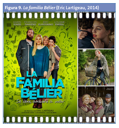La familia Bélier (Eric Lartigeau, 2014), una entrañable película sobre una familia de sordomudos en donde la música es intérprete y las canciones del gran Michel Sardou, cantante mítico francés de varias generaciones, es casi leitmotiv, que les lleva a decir: "Cuando todo va mal y no queda ninguna esperanza, nos queda Michel Sardou". La canción "Je vole" se adapta a las aspiraciones de esta adolescente que tiene dificultades de volar por la gran responsabilidad que supone cuidar de su familia, y la canción "Je vais t´aimer", con el magnífico efecto final de no oír la música, nos coloca en la piel (y los sentidos) de quien no oye, pero siente la música (Cine y Pediatría 281)31 (Fig. 9).