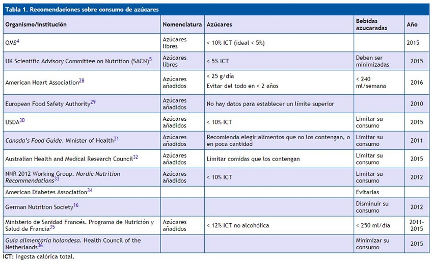 En virtud de todos estos datos diversas instituciones y organismos internacionales de salud pública han establecido recomendaciones orientadas a la reducción del consumo de azúcares (Tabla 1) ya que este consumo es elevado en casi todo el mundo, especialmente en niños29,37. Existe en general consenso en cuanto a la recomendación de reducir el consumo de bebidas azucaradas. No tanto en lo referente al consumo de azúcares añadidos en general, aunque las directrices más recientes tienden a introducir también restricciones en ese sentido. En Europa se ha añadido en 2015 un anexo al Marco de Referencia que regula las iniciativas nacionales sobre los distintos nutrientes en el que se propone reducir los azúcares añadidos en los productos alimenticios un mínimo del 10% para 2020 frente a los niveles de referencia de los Estados miembros a finales de 201538. La reciente directriz de la OMS en 20154, asumida por el SACN5, establece como objetivo ideal reducir el consumo incluso a menos del 5% de la ingesta calórica total. Estas directrices de la OMS y del SACN se refieren a azúcares libres, lo cual supone incluir también la miel y los zumos de frutas entre las fuentes de azúcares a evitar. Proponer este objetivo tan ambicioso, inferior al 5%, ha suscitado cierta controversia, al estar basado únicamente en el riesgo de caries dental, además de lo difícil que puede parecer su cumplimiento6. Algunos autores o instituciones no encuentran evidencia suficiente que justifique restricciones tan concretas29 o propugnan establecer límites solo a las bebidas azucaradas16,34,36. Seguramente futuras investigaciones darán más luz al respecto. No obstante, nos parece importante recordar que, desgraciadamente, la investigación no está exenta de presiones por parte de la industria alimentaria1,39. De hecho, al analizar las revisiones sistemáticas en cuya financiación estaba presente la industria se ha encontrado una mayor probabilidad de mostrar una asociación no positiva o más débil entre obesidad y consumo de bebidas azucaradas que en aquellas revisiones en las que el conflicto de intereses no existía15,18,40.