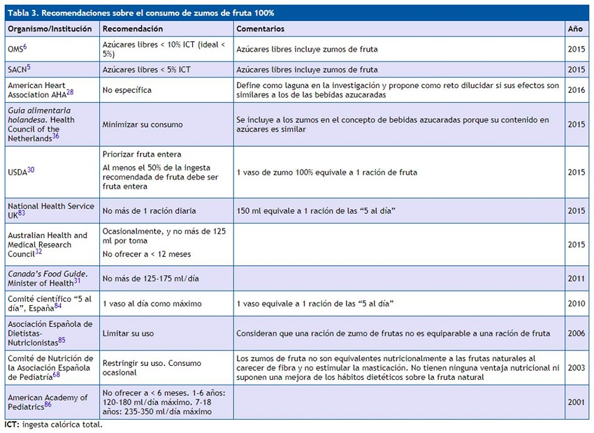 Algunos organismos e instituciones han publicado recomendaciones específicamente sobre el consumo de zumos 100% de fruta, que resumimos en la Tabla 3, en general menos restrictivas que para con las bebidas azucaradas, pero sí que encaminadas a evitar la ingesta de excesivas cantidades de zumo. Pero hoy en día no hay consenso sobre hasta dónde debe llegar esa restricción. Quizás donde mejor se plasme ese debate es en las diferentes opiniones que actualmente existen sobre si los zumos 100% de frutas pueden o no considerarse como una ración de fruta de cara a cumplir con el objetivo, ampliamente aceptado, de cinco raciones de fruta y verdura al día. En España el posicionamiento del Comité Científico "5 al día" sí que acepta esa equivalencia84, al igual que otros autores e instituciones30,83, aunque otros la rechazan42,45,52,85,86. El debate no se centra tanto en si se debe fomentar la fruta entera frente a su consumo en forma de zumo, lo cual en general es aceptado, sino en el papel que puede tener un consumo moderado de zumo 100% de fruta de cara a favorecer el cumplimiento de las recomendaciones sobre ingesta de fruta, en un contexto en el que estas no se suelen cumplir71. No obstante, los grupos que defienden que el zumo de fruta puede favorecer ese cumplimiento no lo hacen a costa de un consumo ilimitado, sino que la mayoría considera que solo una parte de la cantidad de fruta podría sustituirse por zumo (en general solo una ración al día).