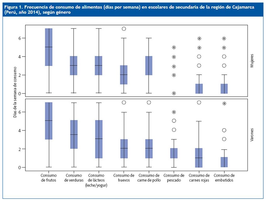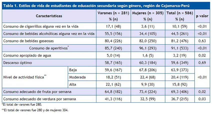 Entre los estilos de vida más difundidos está el consumo de bebidas alcohólicas (44,5%), el alto consumo de bebidas gaseosas (81,2%) y aperitivos (91,1%). Algunos estilos de vida estuvieron asociados con el género; en varones se encontró un mayor consumo de cigarrillos, bebidas alcohólicas y verduras; además de un mayor nivel de actividad física; en mujeres se observó un mayor consumo de aperitivos y frutas. La dieta se caracteriza por el alto consumo semanal de frutas, verduras y lácteos, tanto en varones como en mujeres; los embutidos tienen baja frecuencia de consumo. La carne de mayor consumo es la de pollo, siendo menos frecuente el consumo de carne de pescado y carnes rojas. La dieta encontrada evidencia una disminución en la dieta tradicional y hecha en casa, con incremento del consumo de productos comerciales, comida rápida y comida preparada fuera del hogar. El consumo de agua es usualmente menor del recomendado, y la mayor contribución de líquidos proviene del consumo de bebidas carbonatadas y edulcoradas. Esto podría explicarse porque en el escenario de las escuelas, donde los adolescentes pasan la mayor parte del tiempo, las opciones de comidas saludables son escasas o inexistentes, proliferando alimentos de baja calidad29.