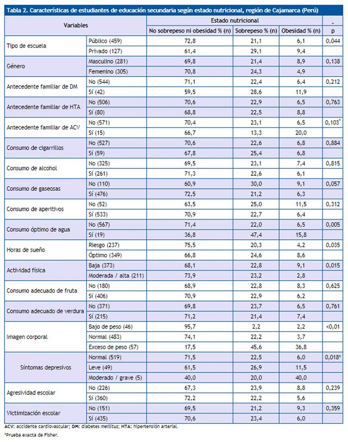 Methods: a cross sectional study was performed in a sample of 586 students, residing in two districts of Cajamarca region. We performed the anthropometric evaluation using the standards of child growth of the World Health Organization (using the score z of the body mass index). We applied a structured survey for recollect data of lifestyles, food consumption, physical activity, depressive symptoms questionnaire, bullying and weight perception. A multivariate logistic regression analysis was performed to identify associated characteristics.