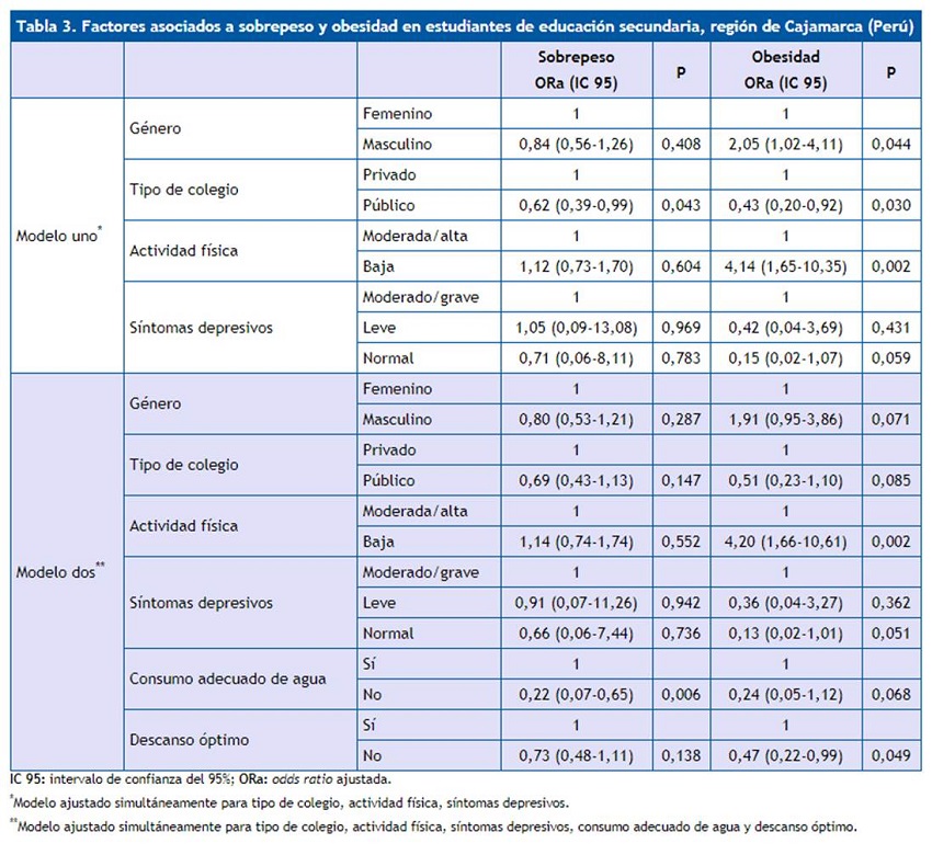 En la Tabla 3 se presentan dos modelos. En el primero, el tipo de colegio resultó independientemente asociado con sobrepeso (OR ajustada: 0,62; IC 95: 0,39 a 0,99; p = 0,043). Con respecto a la obesidad, se encontró asociación con baja actividad física (OR ajustada: 4,14; IC 95: 1,65 a 10,35; p = 0,002) y con el género masculino (OR ajustada: 2,05; IC 95: 1,02 a 4,1; p = 0,044); pertenecer a colegios públicos fue un factor protector contra la obesidad (OR ajustada: 0,43; IC 95: 0,20 a 0,92; p = 0,030). El segundo modelo incluye las variables confusoras, resultando asociadas de forma independiente como factor protector de sobrepeso el "no adecuado consumo de agua" (OR ajustada: 0,22; IC 95: 0,07 a 0,65; p = 0,06); proceder de un colegio público no resultó asociado, aunque mantiene su tendencia a comportarse como factor protector (OR ajustada: 0,69; IC 95: 0,43 a 1,13; p = 0,147). Los factores independientemente asociados a obesidad fueron el bajo nivel de actividad física (OR ajustada: 4,20; IC 95: 1,66 a 10,61; p = 0,002), y como factor protector no tener descanso óptimo (OR ajustada: 0,47; IC 95: 0,22 a 0,99; p = 0,049).