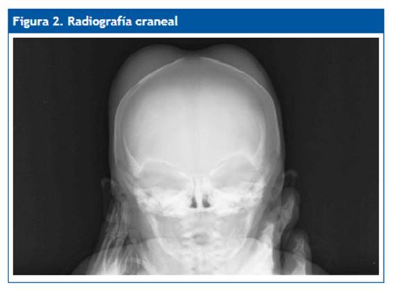 A las 48 horas de vida los padres comenzaron a observar un aumento de volumen en el cuero cabelludo, al principio pequeño, pero con progresión en los siguientes días (Fig. 1). Al sexto día de vida acudieron a la consulta de Pediatría del centro de salud, donde se apreció un abultamiento de gran tamaño en ambas regiones parietales. Tras comprobar que no existía historia familiar de coagulopatía ni evidencia de otros sangrados, se derivó para su valoración hospitalaria.