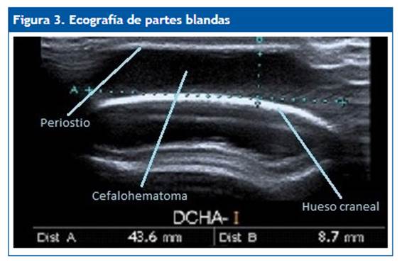 Aunque la evolución generalmente es benigna, es preciso conocer las posibles complicaciones agudas asociadas a esta lesión, tales como la fractura craneal, más frecuente cuando el cefalohematoma es bilateral2,6, o las surgidas durante el curso evolutivo, como calcificación, infección, anemia o ictericia. Para descartar dichas complicaciones, se realizaron a la paciente pruebas complementarias de imagen como la radiografía craneal y la ecografía transfontanelar, que no mostraron alteraciones. La ecografía de partes blandas confirmó el diagnóstico, al comprobar que el hematoma estaba contenido entre el periostio y el díploe externo craneal (Fig. 3).
