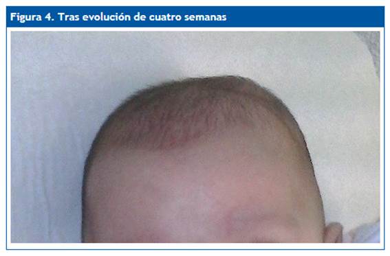 Fue dada de alta con la indicación de seguimiento desde Atención Primaria. Se realizó el seguimiento clínico en la consulta, incluyendo exploración física con biometría de la lesión, así como exploración neurológica y búsqueda activa de signos de complicación semanalmente. Se observó un descenso paulatino del volumen de la lesión, con consistencia homogénea y sin fluctuación. La resolución completa se produjo a las cuatro semanas (Fig. 4). En la actualidad, tras dos años desde el diagnóstico, la paciente se encuentra asintomática y sin secuelas.