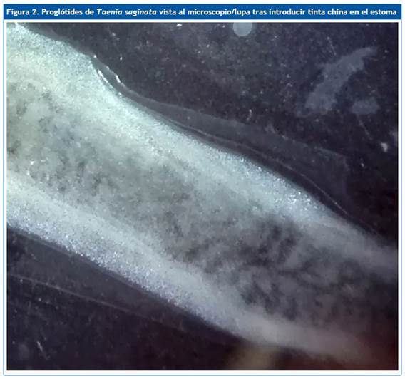 Se remite la muestra al laboratorio de microbiología de referencia, confirmándose por visión directa tras tinción con tinta china (Fig. 2) y reacción en cadena de la polimerasa directa para T. saginata (Centro Nacional, Majadahonda, Madrid). Tras el resultado, se le indica tratamiento con prazicuantel (10 mg/kg) por vía oral en dosis única (medicamento extranjero y off-label ), sin presentar efectos secundarios. A los tres meses se realiza examen de heces en tres muestras, no visualizándose de nuevo proglótides de tenia.