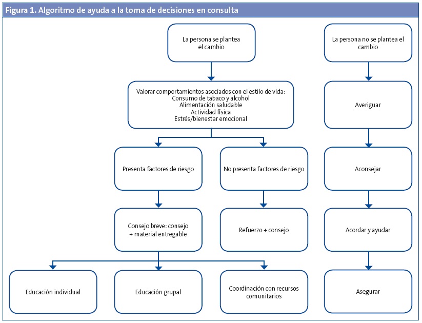 El grupo de trabajo sobre intervenciones de asesoramiento y conductuales del U.S. Preventive Services Task Force (USPSTF) recomienda la adopción de la estrategia de intervención de las cinco Aes (averiguar, aconsejar, acordar, ayudar y asegu rar) para la ejecución de intervenciones conductuales y de consejo sobre los principales factores de riesgo (Tabla 2)8.