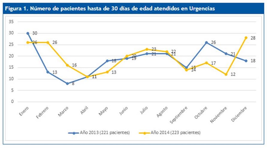 En el Servicio de Urgencias del HMSD, entre los pacientes pediátricos que atiende, considerados estos hasta los 14 años de edad y con unas cifras totales durante el año 2014 de 8893 de urgencias pediátricas, los recién nacidos suponen cuantitativamente una pequeña proporción (2,56%). Sin embargo, este grupo de edad presenta una serie de peculiaridades que lo diferencia del resto de pacientes pediátricos, consecuencia de la gran ansiedad que generan entre su familia ante cualquier síntoma.