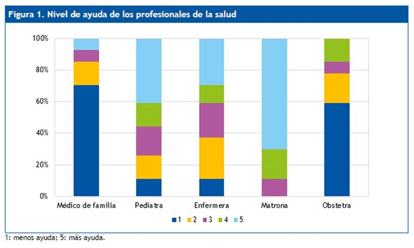 Respecto al nivel de ayuda en los distintos profesionales de la salud, el 65,7% de las madres refieren haber podido contar con algún tipo de apoyo de este colectivo. Los mejor valorados resultan la matrona (4,39 ± 0,69) y el pediatra (3,28 ± 1,44) y los que menos el médico de familia (1,27 ± 1,15) y el obstetra (1,58 ± 1,12) (Fig. 1).