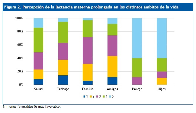 Para completar el estudio, se ha puesto especial interés en la LM a partir del año de vida, incorrectamente llamada LMP. Se evalúan aspectos relevantes a nivel social, con el objetivo de valorar los sentimientos y preocupaciones que tienen las madres en diferentes entornos. Es importante destacar que en el 50% de las madres encuestadas, el mantenimiento de la LM por encima de los 12 meses resulta habitual en su entorno. El nivel de satisfacción con esta experiencia en muy elevado (4,37 ± 0,51 puntos, máximo 5), pero hasta el 48,6% indican algún grado de rechazo social. El 51,4% han tenido algún obstáculo, siendo familia y amigos los más frecuentes. Además, el 45,7% indica haberla tenido que ocultar en algún momento, sobre todo ante familiares o compañeros de trabajo.