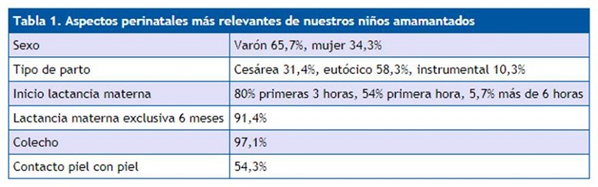 Los aspectos perinatales más relevantes son: el 65,7% son varones. La tasa de cesárea se sitúa en el 31,4%, con un 58,3% de partos eutócicos. El 85,7% resultaron gestaciones a término (> 37 semanas). Únicamente apareció sufrimiento fetal en el 8,5% de los casos y ninguno precisó reanimación avanzada. El inicio de LM ha sido del 80% en las primeras tres horas (el 54% en la primera hora de vida). También se valoran aspectos relevantes como el contacto piel con piel (CPP) al nacimiento, la alimentación con LM exclusiva durante los primeros seis meses, así como la práctica habitual del colecho en las primeras semanas de vida, obteniendo porcentajes del 91,4, 97,1 y 54,3% respectivamente (Tabla 1).