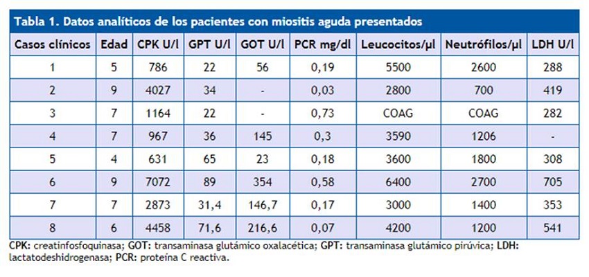Además de los hallazgos de laboratorio descritos (Tabla 1) como la elevación de CPK, la elevación de transaminasas y de la lactatodeshidrogenasa (LDH), cabe destacar en la mayoría de nuestros pacientes leucopenia, que hemos atribuido a la etiología viral5.
