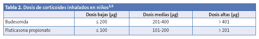 Dosis inicial de corticoides inhalados: una dosis diaria de inicio razonable en niños de hasta 12 años es 200 μg/día de budesonida o 100 μg/día de fluticasona propionato (Tabla 3). En mayores de 12 años, empezar con una dosis de 400 μg/día de budesonida o equivalente4-7. Si la presentación inicial del asma es una exacerbación aguda o un asma no controlado grave, se recomienda empezar con una tanda corta de corticoides orales e iniciar un tratamiento de control regular con dosis alta de CI1,4,5.