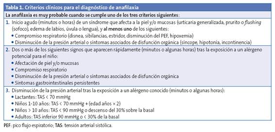 Con el fin de conseguir una definición clínicamente útil, se ha consensuado un conjunto de criterios que facilitan el diagnóstico de la anafilaxia y su manejo. Con estos criterios se consigue englobar a más del 95% de los casos de anafilaxia.
