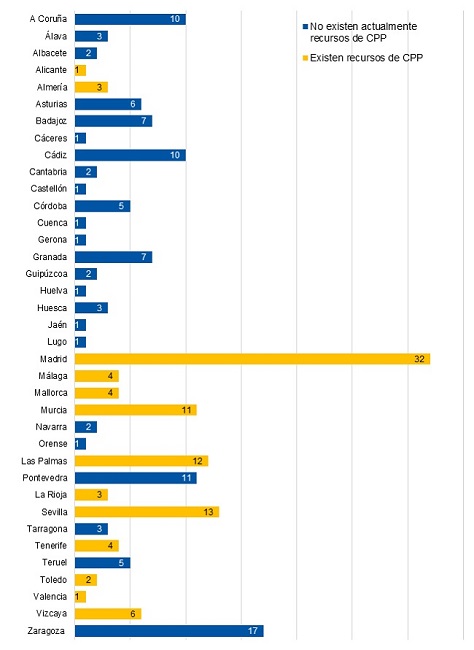 La encuesta la contestaron un total de 211 pediatras de AP. Se excluyeron del análisis nueve. En cuatro casos no se había rellenado la provincia de procedencia y en cinco había más de tres preguntas sin contestar. El tamaño muestral final fue de 202. La distribución de respuestas por provincia, así como si disponen de recursos de CPP, se observa en la Fig. 1.
