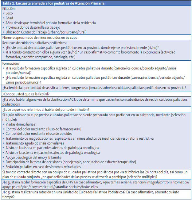 Method: a cross-sectional study was carried out by sending an online survey to Primary Care pediatricians in the Spanish territory. We explored training needs and the desire of participants to be involved in palliative care.