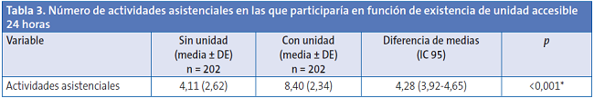 Se calcularon los porcentajes de participación potencial en las diferentes actividades en función de si había existido contacto previo o no con una unidad de CPP. Los resultados que se obtuvieron fueron similares, excepto el incremento de participación en visitas domiciliarias, que alcanzó significación estadística (p = 0,042; OR: 2,14; IC 95: 0,96 a 4,78) y la media del número de actividades potenciales fue superior (4,76 ± 2,46).