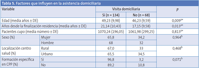 Posteriormente, se dio la opción de elegir en qué actividades participarían si hubiese una unidad de CPP en su provincia con la que existiese la opción de tener contacto telefónico 24 horas y la posibilidad de desarrollo de plan conjunto de cuidados. En todas las actividades se registró un gran incremento en la motivación a participar. Las mayores diferencias porcentuales se encontraron en el tratamiento del dolor con opioides, la disnea y astenia en niños con patología oncológica y la sedación paliativa ante síntomas refractarios (Tablas 3 y 4). Se determinó si existían factores que influyesen en el deseo de participación en la asistencia domiciliaria (Tabla 5). No se encontró asociación con la localización del centro de salud (urbano o rural), sexo, media de niños incluidos en el cupo, ni con si habían recibido formación específica en CPP (aunque sí que la proporción de profesionales que querían participar en la asistencia era superior si la habían recibido). Por otro lado, la edad media de los profesionales, así como el número de años que había trascurrido desde la finalización de la residencia en Pediatría fue superior en el caso de los facultativos que sí deseaban participar en las visitas domiciliarias (p <0,05).