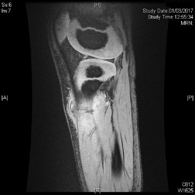 Para caracterizar y determinar la extensión de la lesión se realiza una resonancia magnética de partes blandas y se concluye que el cuerpo extraño corresponde a una espina lineal que afecta a tejido celular subcutáneo, fascia, músculo tibial anterior y posterior y membrana interósea (Fig. 3).