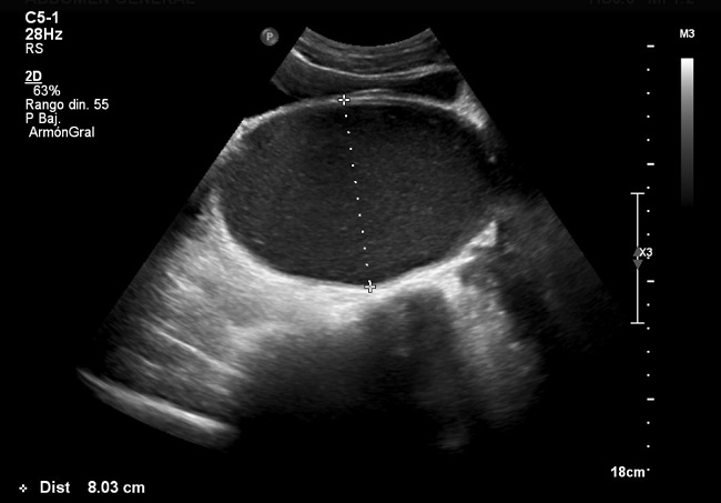 A los diez días acude de nuevo por dolor abdominal intenso que no cede con analgésicos, la despierta por la noche y tiene estreñimiento desde hace un mes. No refiere síntomas miccionales. En la exploración, el estado general es bueno, está afebril, con cardiorrespiratorio normal; se aprecia una gran tumoración abdominal móvil, fluctuante, como si tuviera contenido líquido, de forma alargada, de un tamaño aproximado de 7 × 4 cm, localizada en hipogastrio y fosa iliaca izquierda. Se solicita una ecografía abdominal urgente, en la que se observa una voluminosa lesión quística que ocupa el hipogastrio por detrás de la vejiga, con contenido ligeramente ecogénico, homogéneo, de 16,7 × 8 cm de diámetro, que sugiere como primera posibilidad de diagnóstico hematocolpos por himen imperforado (HIM) (Fig. 1).