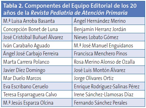 Tras el paréntesis de realismo, volvemos a la celebración de los 20 años de la RPAP, y no puede faltar el capítulo de los agradecimientos, pues haber llegado hasta aquí ha sido posible por el concurso del esfuerzo y generosidad de muchas personas. En primer lugar, a Exlibris Ediciones antes y ahora Lúa Ediciones 3.0, que han apostado al todo o nada y soportado los esfuerzos de edición y logística desde siempre, junto con la AEPap, siempre de la mano. Los miembros del equipo editorial a lo largo de estos años (Tabla 2) han derrochado su generosa y entusiasta dedicación a los objetivos de la RPAP de servir de vehículo de transmisión de la información y conocimiento científico que la Pediatría de Atención Primaria ha necesitado. También es necesario destacar a los centenares de autores que nos han confiado su experiencia y trabajo. Y, finalmente, a los lectores, al colectivo de pediatras de Atención Primaria, a los que va dirigida la revista.