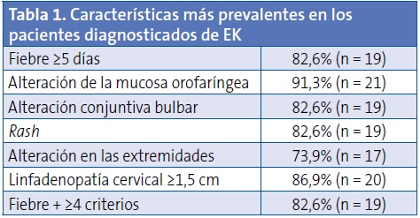 Un total de 25 pacientes fueron diagnosticados de EK entre los años 1997-2016. Se perdió información relativa al diagnóstico en un paciente y se descartó EK en otro paciente tras comenzar con exudación amigdalar bilateral con buena respuesta a antibioterapia oral, siendo ambos excluidos del estudio. Del total de la muestra (n = 23), 20 (87%) fueron diagnosticados de EK clásica y 3 (13%) de EK incompleta. La mediana de edad al diagnóstico en la muestra fue de 2,8 (rango 1,4-5,0) años.